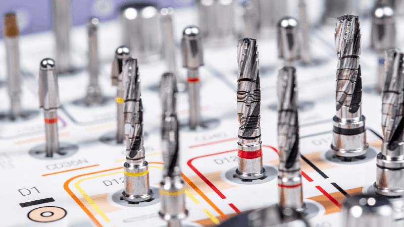 Todos los instrumentos y las fresas para las diferentes líneas de implantes están dispuestos en un orden claro, que se rige por protocolos quirúrgicos similar.