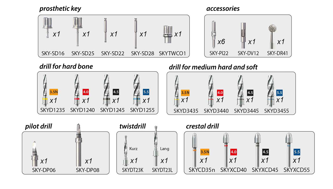 If you would like to work with drill stops, order the drill stop box. Alternatively, you can order the metal tray. This allows you to sterilise abutments, for example.
